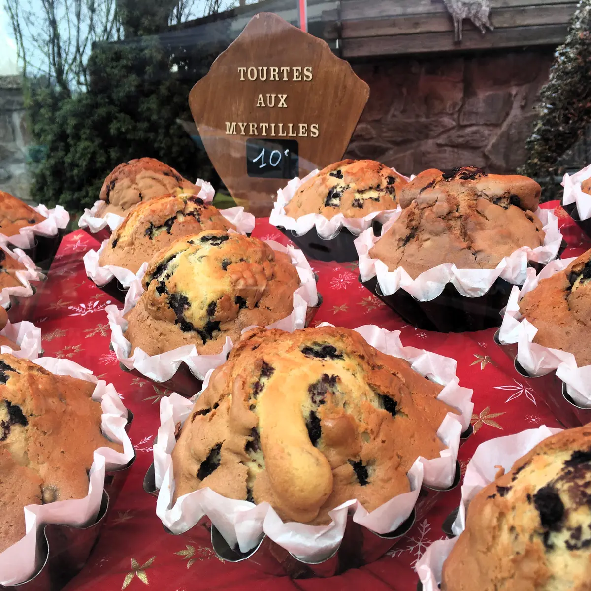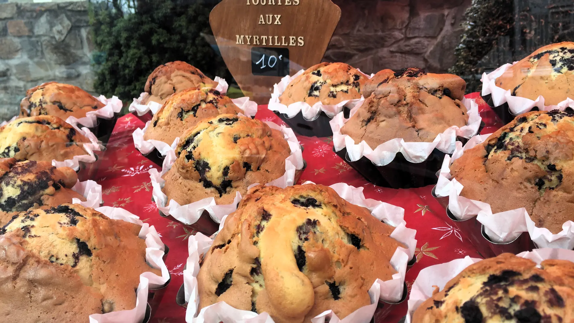 La habitación tiene una cama doble con una colcha roja y almohadas beige. Las cortinas rojas y blancas enmarcan una gran ventana que ofrece una vista de las montañas. Un pequeño oso de peluche está sentado en la cama. A la derecha, hay una silla de madera con un cojín y una mesita de noche de madera con varios objetos.